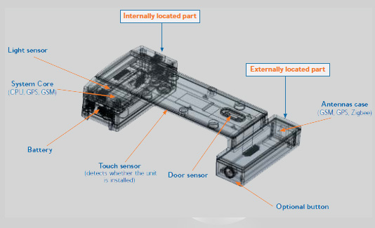 El dispositivo cuenta con una serie de accesorios (sensores) incorporados en la misma unidad. Aparte de los ya mencionadas magnetos, que sirven para la fijación del dispositivo al contenedor se cuenta con: